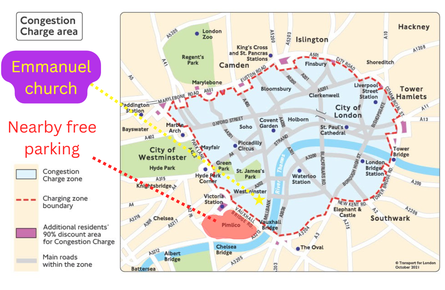 To avoid congestion charge, free parking is available an enjoyable 10 minute walk away in Pimlico (see map).